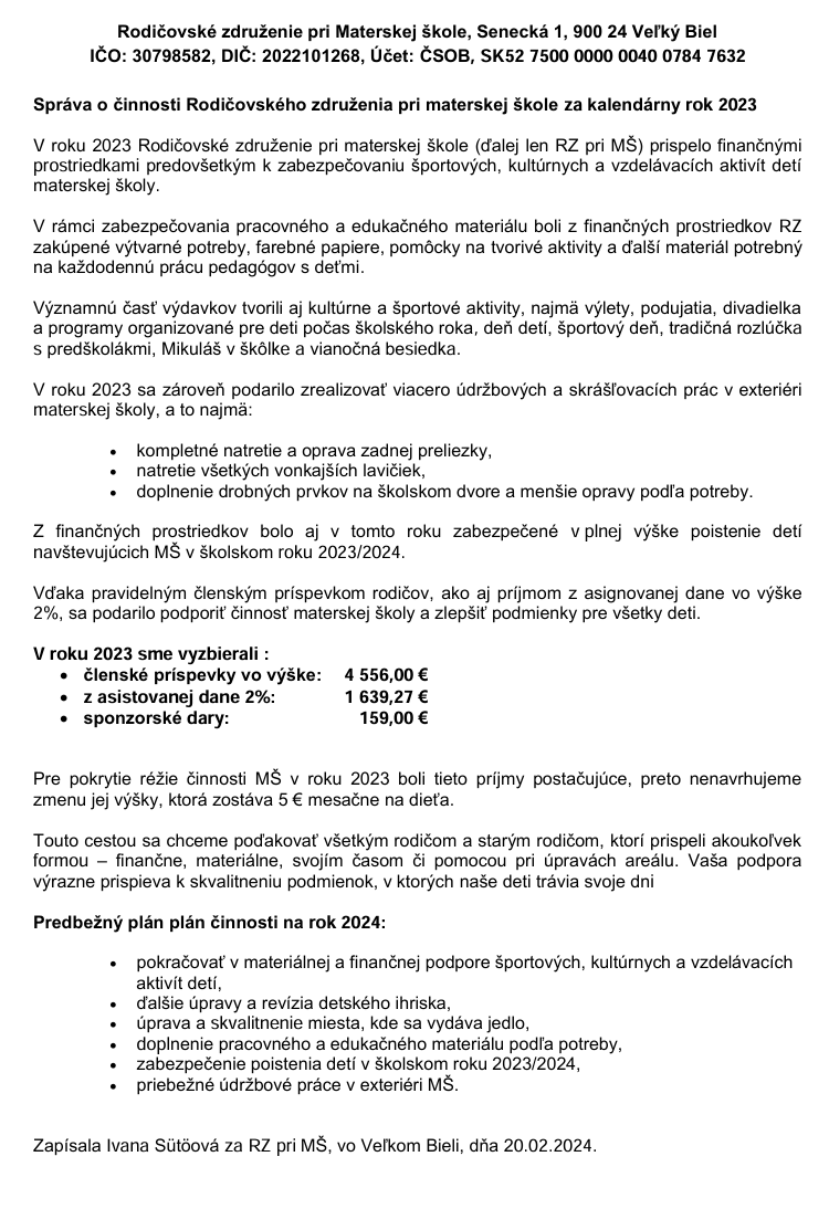 Zapísala Ing.arch. Ivana Píšová za RZ pri MŠ, vo Veľkom Bieli, dňa 10.02.2022
